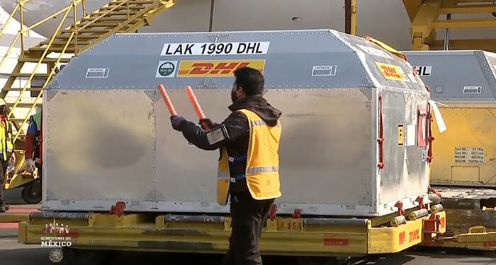 381 mil 225 vacunas llegaron al Aeropuerto Internacional de la Ciudad de México (AICM), donde fueron recibidas por un comité encabezado por Alejandro Svarch, quien recientemente fue designado como titular de la Comisión Federal para la Protección contra Riesgos Sanitarios (Cofepris).